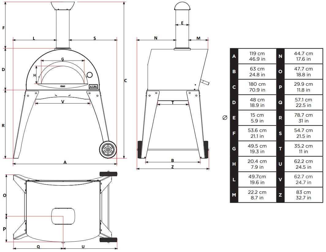 Piece na drewno CIAO wyróżniają się oryginalnym designem i dużymi kołami. Palenisko z cegły ogniotrwałej oraz kopuła ze stali nierdzewnej zapewniają niepowtarzalny aromat gotowania w piecu opalanym drewnem.