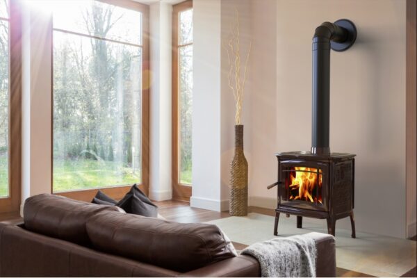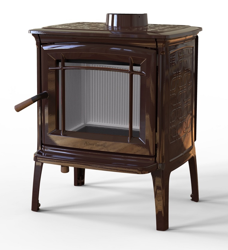 Kolekcję Hearthstone wyróżniają eleganckie kształty, pasujące do nowoczesnych i tradycyjnych wnętrz. Wnętrze kominka wypełnione białym żeliwem podkreśla urok tańczących płomieni. Piec dostępny jest w matowym czarnym i emaliowanym brązowym wykończeniu.